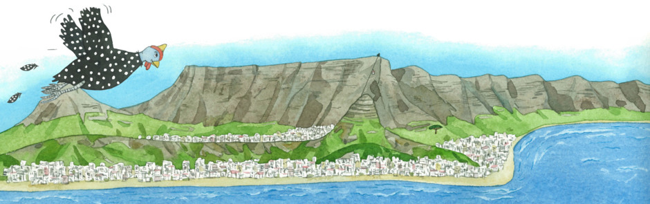 Ich bin ein Perlhuhnjunge und lebe mit meiner Herde in Camps Bay, einem Wohnviertel von Kapstadt oberhalb der gleichnamigen Meeresbucht. Unsere Schlafbäume stehen an den Hängen der majestätischen 12 Apostel-Berge, dort, wo die Häuser der Menschen aufhören und die Natur beginnt!