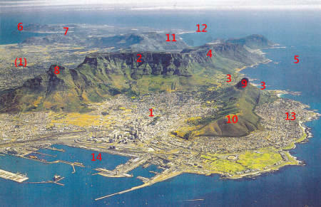 1 Kapstadt „City Bowl“ (Innenstadt) 2 Tafelberg (Teil der Tafelberg-Gebirgskette) 3 Camps Bay (Wohnviertel und Bucht) 4 12 Apostel (Teil der Tafelberg-Gebirgskette) 5 Atlantischer Ozean 6 Cape Point 7 Boulders bei Simon´s Town 8 Devil´s Peak 9 Lion´s Head 10 Signal Hill 11 Chapman´s Peak 12 Kommetjie 13 Sea Point 14 Hafen