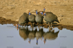Wir Helmperlhühner leben nur dort, wo es ausreichend frisches Trinkwasser gibt, weil wir regelmäßig trinken müssen. Und ds tun wir gerne in geselligen Gruppen.